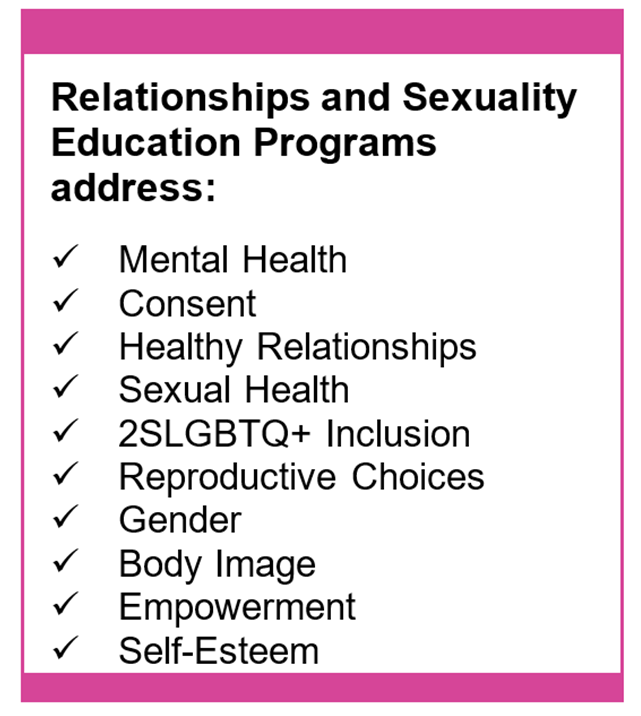 Today, our Relationships and Sexuality Education (RSE) program, offered to junior and senior high school students in communities beyond Calgary, is evidence-informed and delivered by highly trained educators. Through engaging discussions and activities, youth build the knowledge, skills, and motivation to make informed, healthy choices about their bodies, relationships, and sexuality. RSE emphasizes emotional and interpersonal skills as fundamental elements of sexual health education.